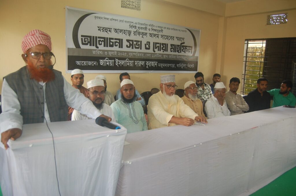 কুরআন শিক্ষা প্রশিক্ষণ বোর্ড বাংলাদেশ এর ইন্তেজামিয়া কমিটির সহ-সভাপতি ও বোর্ড কমপ্লেক্সস্থ ফয়জুল হক জামে মসজিদের সহ-সভাপতি, সিলেট সিটি সুপার মার্কেটস্থ বাবলা এন্ড ব্রাদার্স এর সত্বাধিকারী মরহুম আলহাজ রফিকুল আলম স্বরনে, জামিয়া মিলনায়তনে অদ্য ০৩ জুলাই বৃহস্পতিবার সকাল ১১ ঘটিকায়,জামিয়া ইসলামিয়া দারুল কুরআন মজুমদারপাড়া, ঘাসিটুলা সিলেট এর উদ্দ্যোগে এক আলোচনা সভা ও দোয়া মাহফিল অনুষ্ঠিত হয়। জামিয়ার প্রতিষ্ঠাতা প্রিন্সিপাল শায়খুল ক্বুররা মাওলানা মুজ্জাম্মিল হোসাইন চৌধুরীর সভাপতিত্বে ও মাদ্রাসার শিক্ষা সচিব মাওলানা ক্বারী মাহমুদল হাসান ও জামিয়ার সিনিয়র শিক্ষক মাওলানা ক্বারী বিলাল আহমদ এর যৌথ পরিচালনায় উক্ত দোয়া মাহফিলে বক্তব্য রাখেন ও উপস্থিত ছিলেন, ইন্তেজামিয়া কমিটির সভাপতি আলহাজ বাবর বক্স, বোর্ডের সহকারী মহাপরিচালক ও মাদ্রাসার নাইবে মুহতামিম মাওলানা ক্বারী মুফতী সিকন্দর আলী, বোর্ডের সহকারী মহাপরিচালক ও শাবিপ্রবির কেন্দ্রীয় মসজিদের ইমাম ও খতিব মাওলানা ক্বারী মতিউর রহমান,বোর্ডের কার্যনির্বাহী পরিষদের অন্যতম সদস্য মাওলানা ক্বারী মুখতার আহমদ,বোর্ডের অর্থ সম্পাদক সাংবাদিক মাওলানা ক্বারী হাকীম ফারুক আহমদ নোমান,বোর্ডের শুরা সদস্য ও ফয়জুল হক জামে মসজিদের সহ সভাপতি শেখ মোহাম্মদ মঈন উদ্দিন, ঘাসিটুলা জামে মসজিদের মুতাওয়াল্লী মো: আব্দুল মতিন, মজুমদারপাড়া জামে মসজিদের সহ সভাপতি হাবিবুর রহমান, ফয়জুল হক জামে মসজিদের কোষাধক্ষ্য বাবলা মিয়া, বোর্ডের শুরা সদস্য আতিকুর রহমান লিপু, মরহুমের ছেলে বাবলা আহমদ ও বাবর আহমদ, মরহুমের জামাতা রুহেল আহমদ, আব্দুল জলিল, মাহিদ আহমদ, আব্দুল ওয়াহিদ, ইসমাঈল আহমদ, জামিয়ার শিক্ষক মাওলানা ক্বারী সিফাত উল্লাহ, মাওলানা ক্বারী ছাইদুর রহমান, মাওলান হাফিজ সামছুজ্জামান, মাওলানা হাফিজ ফুযায়েল আহমদ, মাওলানা ক্বারী জয়নাল আবেদীন, মাওলানা ক্বারী শামিম আহমদ, হাফিজ আলী হুসাইন, মাওলানা জুবায়ের আহমদ কামরান, মাওলানা ক্বারী আমির হামযা, বোর্ডের অন্যতম সদস্য মাওলানা ক্বারী আজিজুল ইসলাম, মাওলানা হাফিজ আহমদ হুসেন রাজন, মাস্টার রোমান আহমদ প্রমূখ। ব্যক্তারা মরহুম রফিকুল আলমের সামাজিক ও ধর্মীয় কাজের কথা শ্রদ্বাভরে স্বরন করেন এবং বলেন রফিকুল আলম আজীবন অত্র প্রতিষ্ঠানের খয়েরখাঁ ছিলেন । সভা শেষে মরহুমের রুহের মাগফেরাত কামনা করে মোনাজাত করা হয়।