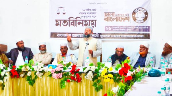 সোমবার (২৬ জানুয়ারি) দুপুর ২টায় বাংলাদেশ জামায়াতে ইসলামীর ছাতক উপজেলা কার্যালয়ে ১১ দলীয় জোটের উদ্যোগে এ সভা অনুষ্ঠিত হয়। সভায় সভাপতিত্ব করেন বাংলাদেশ খেলাফত মজলিস ছাতক উপজেলা শাখার সভাপতি মাওলানা আব্দুল কাদির। উপজেলা জামায়াতের আমীর মাওলানা আকবর আলী ও সেক্রেটারি হাফিজ জাকির হোসাইনের যৌথ সঞ্চালনায় সভাটি পরিচালিত হয়।
