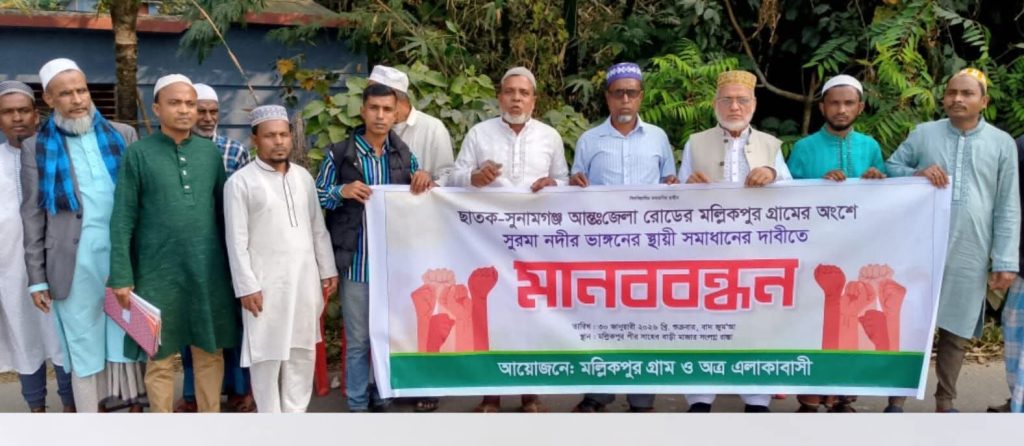 সুরমা নদীর তীব্র ভাঙনের কবল থেকে ছাতক উপজেলার মল্লিকপুর গ্রাম ও আশপাশের এলাকা রক্ষায় দ্রুত কার্যকর ও স্থায়ী ব্যবস্থা গ্রহণের দাবিতে মানববন্ধন কর্মসূচি পালন করেছেন স্থানীয় বাসিন্দারা।