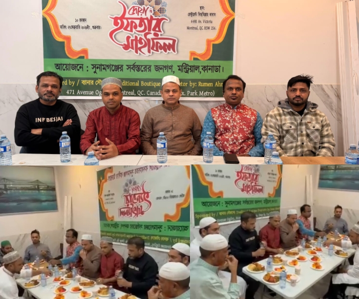 কানাডার মন্ট্রিয়াল শহরে বসবাসরত সুনামগঞ্জ জেলার প্রবাসীদের উদ্যোগে ১০ রমজান, ২৭ ফেব্রুয়ারি ২০২৬ খ্রিস্টাব্দে ইফতার ও দোয়া মাহফিল অনুষ্ঠিত হয়েছে। মন্ট্রিয়ালের কোট-দে-নেজ এলাকার রেস্টুরেন্ট বিসমিল্লাহ কাবাব-এ এ আয়োজন সম্পন্ন হয়।