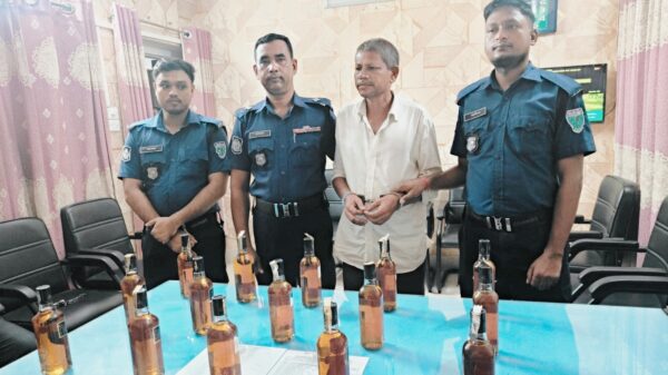 অভিযানকালে আফজাল সু স্টোরের সামনের পাকা রাস্তায় অবস্থানকালে এক ব্যক্তি পুলিশের উপস্থিতি টের পেয়ে হাতে থাকা সাদা প্লাস্টিকের ব্যাগ নিয়ে পালানোর চেষ্টা করে। পরে পুলিশ সদস্যরা ধাওয়া করে তাকে আটক করেন। এসময় তল্লাশি চালিয়ে তার বহন করা ব্যাগ থেকে ১৫ বোতল ভারতীয় এসি ব্ল্যাক মদ উদ্ধার করা হয়।